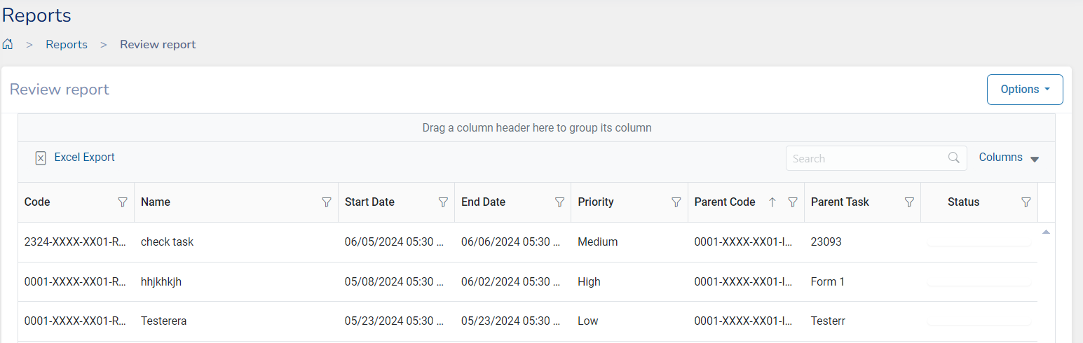 · Report entries can also be grouped by dragging and a column to the space provided, as shown below